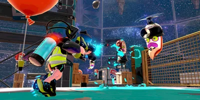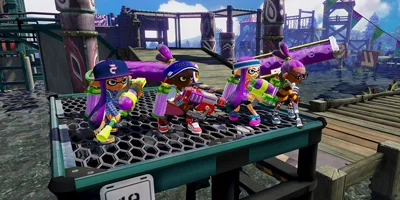 Transform into a squid to hide in your own ink, climb up walls, and move more quickly. Use ink blasters, ink bombs, ink rollers, and squid power to cover the most territory.