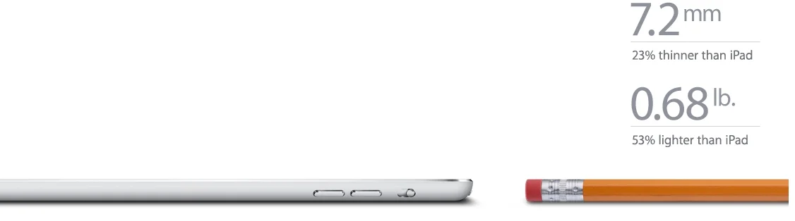 iPad mini has everything that makes an iPad an iPad, but it’s a fraction of the size. At just 7.2 millimeters, it’s pencil thin and unbelievably light.3 You can easily hold it in your palm. And stash it in your smallest bag without a second thought, so it’s always close at hand.